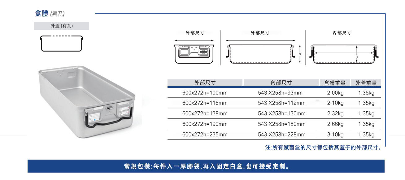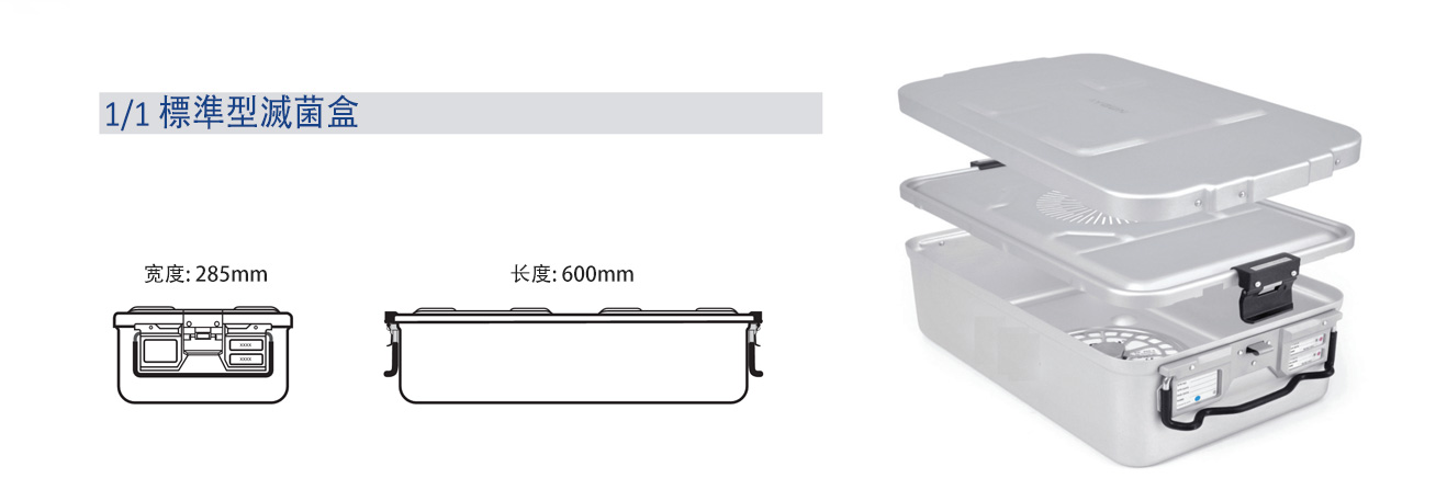 1/1 標準型滅菌盒 外部尺寸 600mm x 285mmx100mm 內部尺寸 543mm X 258mmX100mm 銀色